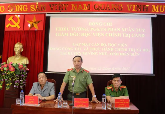 Đồng chí Thiếu tướng, PGS.TS Phan Xuân Tuy, Bí thư Đảng ủy, Giám đốc Học viện gặp mặt cán bộ, học viên đang công tác và thực hành chính trị xã hội tại huyện Mường Nhé, tỉnh Điện Biên