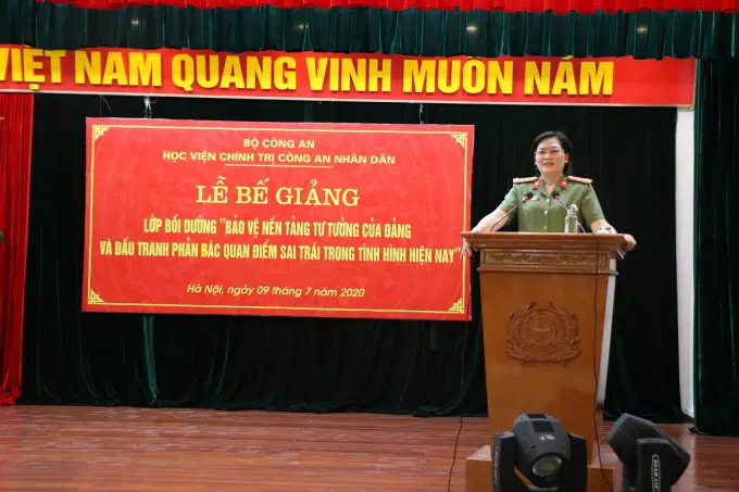 Phát biểu tại Lễ Bế giảng, đồng chí Đại tá Đinh Ngọc Hoa, Phó Giám đốc Học viện chúc mừng các đồng chí học viên đã hoàn thành xuất sắc chương trình bồi dưỡng; cảm ơn Cục Đào tạo và các đơn vị chức năng của Bộ Công an đã tạo điều kiện, phối hợp chặt chẽ với Học viện Chính trị Công an nhân dân tổ chức thành công khóa học. Đồng chí hy vọng, quá trình học tập vừa qua sẽ giúp các học viên trang bị, tích lũy thêm cho bản thân những kiến thức hữu ích trong nhận diện các quan điểm sai trái, thù địch, thông tin xấu, chống Đảng, Nhà nước; công tác phòng ngừa, đấu tranh phản bác quan điểm sai trái, thù địch trong tình hình mới; nắm vững quan điểm, mục tiêu, nhiệm vụ, giải pháp bảo vệ vững chắc nền tảng tư tưởng của Đảng, củng cố và tăng cường niềm tin khoa học vào chủ nghĩa Mác - Lênin, tư tưởng Hồ Chí Minh, đường lối, chủ trương của Đảng, thực sự là “thanh bảo kiếm” bảo vệ Đảng, Nhà nước, nhân dân và chế độ xã hội chủ nghĩa.