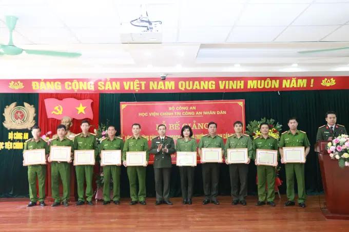 Đồng chí Thượng tá. TS Tống Văn Khuông, Phó Giám đốc Học viện tặng giấy khen cho các học viên có thành tích xuất sắc và trao chứng chỉ cho đại diện học viên của Lớp bồi dưỡng
