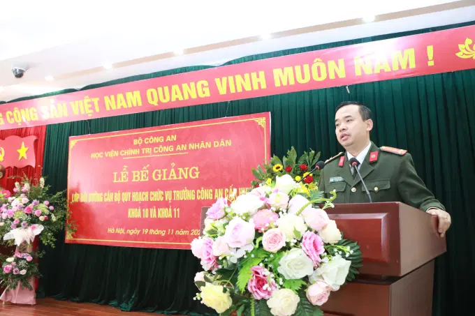 Phát biểu tại buổi lễ, Thượng tá, TS Tống Văn Khuông, Phó Giám đốc Học viện chúc mừng các học viên đã hoàn thành chương trình bồi dưỡng. Tham gia khóa học, các học viên đã được trang bị các kiến thức mới, mang tính cập nhật, bổ sung về chính trị, pháp luật, nghiệp vụ, phương pháp, phong cách lãnh đạo, chỉ huy, tham mưu, điều hành…, đáp ứng yêu cầu thực tiễn đặt ra. Đồng chí hy vọng, các đồng chí học viên sẽ luôn cập nhật các chủ trương, đường lối, chính sách của Đảng, Nhà nước; chăm lo xây dựng đơn vị đoàn kết, thống nhất, trong sạch, vững mạnh, phát triển; chỉ đạo đơn vị hoàn thành tốt nhiệm vụ bảo đảm an ninh trật tự, chính trị nội bộ.
