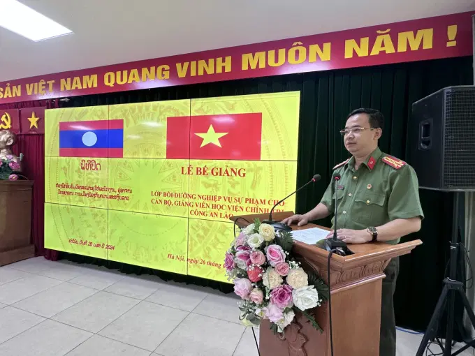 Phát biểu tại lễ bế giảng, đồng chí Đại tá, TS Tống Văn Khuông, Ủy viên Ban Thường vụ Đảng ủy, Phó Giám đốc Học viện Chính trị CAND nhiệt liệt chúc mừng các học viên đã hoàn thành lớp học đạt kết quả cao. Mặc dù thời gian học tập không dài, có nhiều khó khăn, đặc biệt là rào cản ngôn ngữ nhưng toàn thể học viên đã nêu cao tinh thần trách nhiệm, nỗ lực, phấn đấu, hoàn thành nhiệm vụ học tập. Đồng chí Phó Giám đốc bày tỏ mong muốn các kiến thức được học tập tại Học viện sẽ được các học viên áp dụng hiệu quả vào các lĩnh vực công tác đang đảm nhiệm, góp phần hoàn thành tốt nhiệm vụ được giao, xây dựng Học viện Chính trị Công an Lào trở thành cơ sở giáo dục trọng yếu, uy tín về lý luận chính trị và xây dựng lực lượng của lực lượng Công an Lào. Đồng thời, các học viên cũng mang theo những kỷ niệm đẹp về tình cảm hữu nghị giữa hai nước, hai lực lượng Công an và hai học viện, tiếp tục vun đắp cho mối quan hệ hữu nghị vĩ đại, đoàn kết đặc biệt và hợp tác toàn diện Việt Nam - Lào.