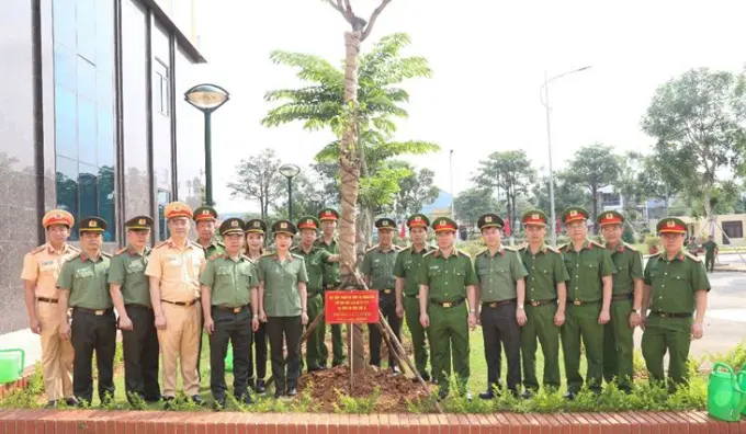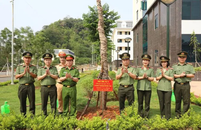 Đoàn công tác và học viên lớp học trồng cây lưu niệm tại khuôn viên trụ sở Công an tỉnh Sơn La