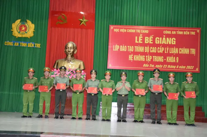 Ngày 23/9/2022, tại Công an tỉnh Bến Tre, Học viện Chính trị Công an nhân dân tổ chức Lễ Bế giảng Lớp Đào tạo trình độ cao cấp lý luận chính trị, hệ không tập trung - Khóa 9 mở tại Công an tỉnh.Đồng chí Trung tướng, PGS. TS Phan Xuân Tuy, Bí thư Đảng ủy, Giám đốc Học viện chủ trì buổi Lễ. Tham dự buổi Lễ có: đồng chí Trần Văn Thiêm, Phó Trưởng ban tổ chức tỉnh uỷ Bến Tre; Đại tá Phạm Văn Ngót, Phó Bí thư Đảng uỷ, Phó Giám đốc Công an tỉnh Bến Tre; đại diện lãnh đạo các đơn vị chức năng của Học viện Chính trị CAND; Công an tỉnh Bến Tre cùng toàn thể học viên Khoá học.
