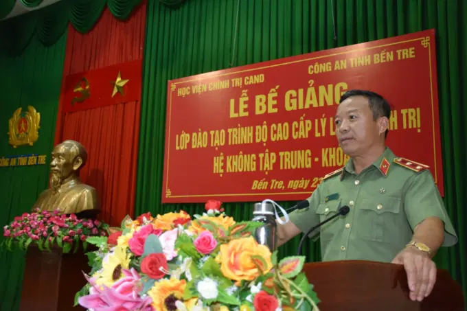 Phát biểu tại buổi lễ, Trung tướng, PGS.TS Phan Xuân Tuy chúc mừng các học viên đã hoàn thành tốt khóa học, đạt kết quả cao; gửi lời cảm ơn sự phối hợp, giúp đỡ nhiệt tình, trách nhiệm của các cơ quan, đơn vị chức năng Công an tỉnh Bến Tre, đặc biệt là đội ngũ giảng viên, nhà khoa học để khoá học thành công tốt đẹp. Đồng chí Giám đốc hy vọng, các học viên tiếp tục học tập, nghiên cứu, thường xuyên tự cập nhật thông tin, làm giàu tri thức của mình, kết hợp giữa “học với hành”, áp dụng những kiến thức được học vào quá trình triển khai nhiệm vụ, chuyên môn; có những nghiên cứu, phát hiện, đề xuất tham mưu về những vấn đề mới dưới góc nhìn khoa học chính trị đặt ra trong quá trình công tác; không ngừng trau dồi, bồi dưỡng lý luận chính trị, phấn đấu, rèn luyện tư cách người cán bộ, chiến sỹ CAND theo tấm gương đạo đức, phong cách Hồ Chí Minh, sẵn sàng nhận và hoàn thành mọi nhiệm vụ được giao.