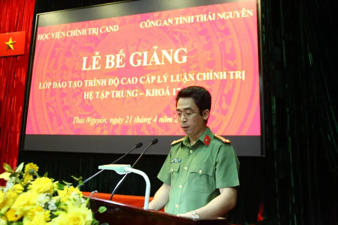 Phát biểu tại buổi lễ, đồng chí Thượng tá Nguyễn Hoàng Trí Kháng, Ủy viên Ban thường vụ Đảng ủy, Phó Giám đốc Công an tỉnh Thái Nguyên trân trọng cảm ơn Đảng ủy, Ban Giám đốc Học viện Chính trị CAND đã tổ chức lớp đào tạo trình độ cao cấp LLCT dành cán bộ Công an tỉnh Thái Nguyên và Trại giam Phú Sơn 4, C10 - Lớp đào tạo trình độ cao cấp LLCT đầu tiên được tổ chức tại Công an tỉnh Thái Nguyên, góp phần chuẩn hóa tiêu chuẩn LLCT cho cán bộ của Công an tỉnh Thái Nguyên. Hi vọng trong thời gian tới, Học viện Chính trị CAND; Cục Đào tạo, Bộ Công an tiếp tục quan tâm, tạo điều kiện tổ chức các lớp đào tạo LLCT (cao cấp LLCT, trung cấp LLCT) cho cán bộ chiến sỹ cho Công an tỉnh Thái Nguyên trong thời gian tới, nhằm đáp ứng yêu cầu chuẩn hóa tiêu chuẩn cán bộ theo quy định lực lượng CAND, đáp ứng nhiệm vụ bảo vệ an ninh trật tự trong tình hình mới. Đồng thời, đồng chí Phó Giám đốc Công an tỉnh biểu dương kết quả học tập, chúc mừng các đồng chí học viên đã hoàn thành khóa học và được nhận bằng cao cấp LLCT, đề nghị các đồng chí học viên khi trở về đơn vị công tác không ngừng trau dồi bản lĩnh chính trị và vận dụng tốt các kiến thức đã học vào nhiệm vụ thực tế công tác của đơn vị.