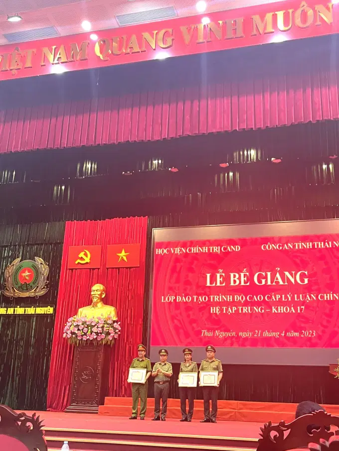 Thực hiện Kế hoạch số 859/KH-T03-P3, ngày 18/4/2023 của Học viện Chính trị CAND về việc tổ chức Lễ Bế giảng lớp đào tạo trình độ cao cấp LLCT, hệ tập trung Khóa 17 tổ chức tại Công an tỉnh Thái Nguyên dành cho cán bộ đang công tác tại Công an tỉnh Thái Nguyên và Trại giam Phú Sơn 4, C10, sáng ngày 21/4/2023, Học viện phối hợp với Công an tỉnh Thái Nguyên tổ chức Lễ bế giảng khóa học. Đồng chí Trung tướng, PGS.TS Phan Xuân Tuy, Bí Thư Đảng ủy, Giám đốc Học viện Chính trị CAND dự và chủ trì buổi Lễ. Tham dự Lễ bế giảng có đồng chí Thượng tá Nguyễn Hoàng Trí Kháng, Ủy viên Ban thường vụ Đảng ủy, Phó Giám đốc Công an tỉnh Thái Nguyên; đồng chí Đại tá, TS Nguyễn Anh Tuấn, Phó Bí thư Đảng ủy, Phó Cục trưởng Cục Đào tạo, Bộ Công an; đồng chí Lê Quang Trung, Phó Trưởng ban Ban Tổ chức Tỉnh ủy tỉnh Thái Nguyên; đồng chí TS Nguyễn Xuân Quang, Phó Trưởng ban Ban Tuyên giáo Tỉnh ủy tỉnh Thái Nguyên; đồng chí TS Nguyễn Phúc Ái, Phó Hiệu trưởng Trường Chính trị tỉnh Thái Nguyên; đại diện lãnh đạo các đơn vị chức năng của Học viện Chính trị CAND, Cục Đào tạo, Công an tỉnh Thái Nguyên và Trại giam Phú Sơn 4, C10 cùng toàn thể học viên lớp học.