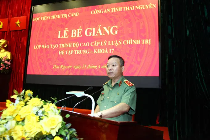 Phát biểu chỉ đạo tại buổi Lễ, đồng chí Giám đốc Học viện khẳng định khóa học đã hoàn thành tốt mục tiêu, yêu cầu của chương trình đào tạo đề ra; đồng chí biểu dương, đánh giá cao kết quả học tập, rèn luyện của học viên khóa học, trong đó tỉ lệ học viên đạt loại Giỏi chiếm tỉ lệ cao, có các học viên đạt thành tích học tập xuất sắc được Giám đốc Học viện Chính trị CAND tặng giấy khen. Đồng thời, kết quả đào tạo của khóa học đã tăng cường cho Công an tỉnh Thái Nguyên nhiều cán bộ nguồn có trình độ cao cấp LLCT đáp ứng yêu cầu công tác cán bộ trong thời gian tới, góp phần chuẩn hóa các điều kiện, tiêu chuẩn lý luận chính trị cho cán bộ Công an tỉnh Thái Nguyên đáp ứng yêu cầu, nhiệm vụ trong tình hình mới. Đồng chí Giám đốc Học viện quán triệt và đề nghị các học viên sau khi hoàn thành khóa học, trở về đơn vị công tác luôn luôn là những hạt nhân kiểu mẫu về giáo dục chính trị tư tưởng, tích cực truyền bá những giá trị đạo đức cách mạng, đem những giá trị tri thức tiếp thu được trong quá trình học tập áp dụng ngay vào thực tiễn công tác; tham mưu với cấp ủy, chính quyền địa phương triển khai có hiệu quả song song 02 nghị quyết của Bộ Chính trị: Nghị quyết số 12-NQ/TW, ngày 26/3/2022 của Bộ Chính trị về đẩy mạnh xây dựng lực lượng CAND thật sự trong sạch, vững mạnh, chính quy, tinh nhuệ, hiện đại, đáp ứng yêu cầu, nhiệm vụ trong tình hình mới; Nghị quyết số 11-NQ/TW, ngày 10/02/2022 của bộ Chính trị về phương hướng phát triển kinh tế - xã hội, dảm bảo quốc phòng, an ninh vùng trung du và miền núi Bắc Bộ đến năm 2030, tầm nhìn đến năm 2045. Phát huy vai trò là những hạt nhân trong các mặt công tác, nhất là công tác tuyên truyền, bảo vệ chủ nghĩa Mác - Lênin, tư tưởng Hồ Chí Minh, đường lối đổi mới của Đảng, Nhà nước, tạo sức lan tỏa mạnh mẽ trong các chi bộ, đảng bộ, cơ quan, đơn vị công tác, trong gia đình, trong quần chúng nhân dân về truyền thống anh hùng và hình ảnh tốt đẹp của người chiến sĩ CAND “bản lĩnh, nhân văn, vì nhân dân phục vụ”; thực hiện thắng lợi Nghị quyết số 16-NQ/ĐUCA, ngày 18/01/2023 của Đảng ủy Công an Trung ương về tăng cường công tác chính trị, tư tưởng đáp ứng yêu cầu xây dựng lực lượng CAND thật sự trong sạch, vững mạnh, chính quy, tinh nhuệ, hiện đại.