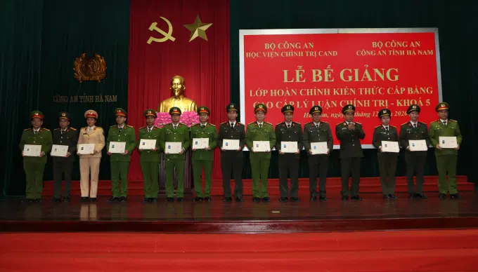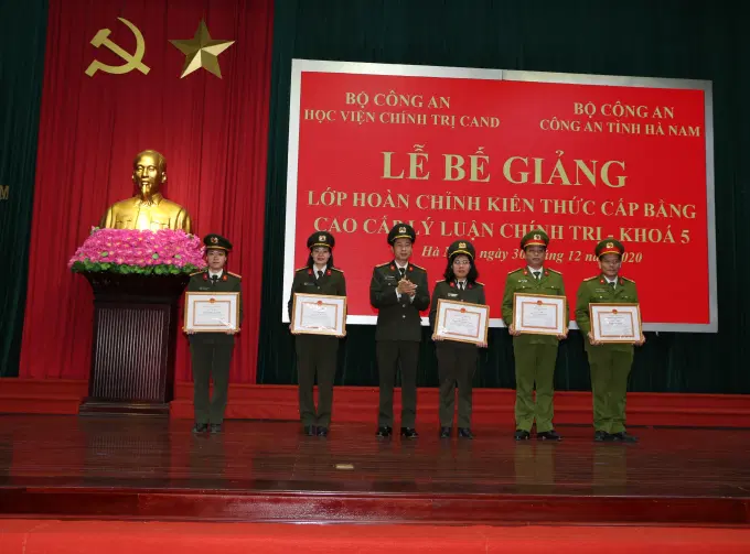 Ngày 30/12, Học viện Chính trị Công an nhân dân phối hợp với Công an tỉnh Hà Nam tổ chức Lễ bế giảng lớp hoàn chỉnh kiến thức cấp bằng Cao cấp lý luận chính trị khoá 5 tại Hà Nam cho 100 học viên là lãnh đạo, chỉ huy, cán bộ, chiến sỹ Công an các tỉnh: Hà Nam, Nam Định, Ninh Bình, Hưng Yên, Thanh Hóa và Trại giam Nam Hà. Dự Lễ bế giảng có các đồng chí: Trung tướng, PGS.TS. Trần Vi Dân – Giám đốc Học viện Chính trị Công an nhân dân; Đại tá Lê Văn Tuấn – Phó Giám đốc Công an tỉnh Hà Nam.