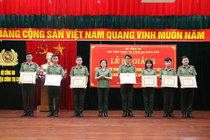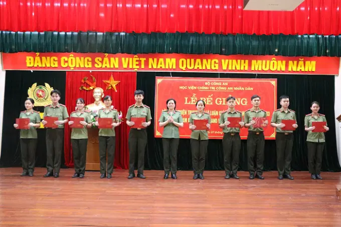 Đồng chí Đại tá, PGS. TS Đinh Ngọc Hoa, Phó Giám đốc Học viện trao Giấy khen của đồng chí Giám đốc Học viện Chính trị Công an nhân dân cho các học viên có thành tích xuất sắc trong học tập và rèn luyện; trao chứng chỉ cho các học viên