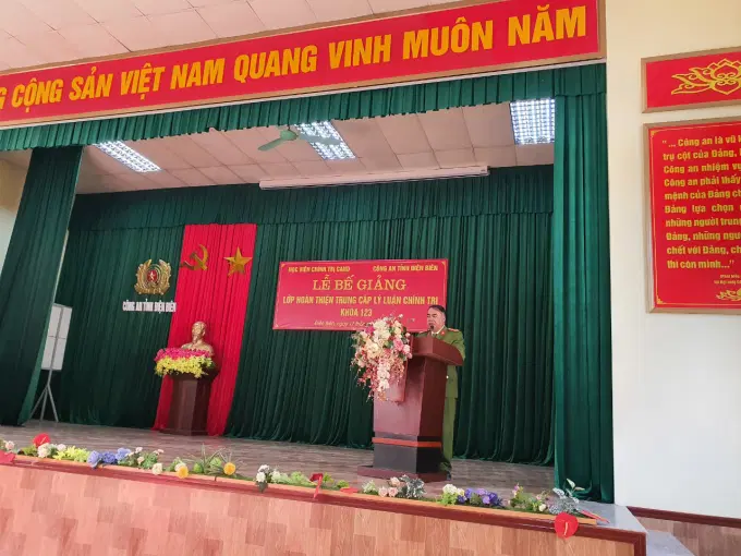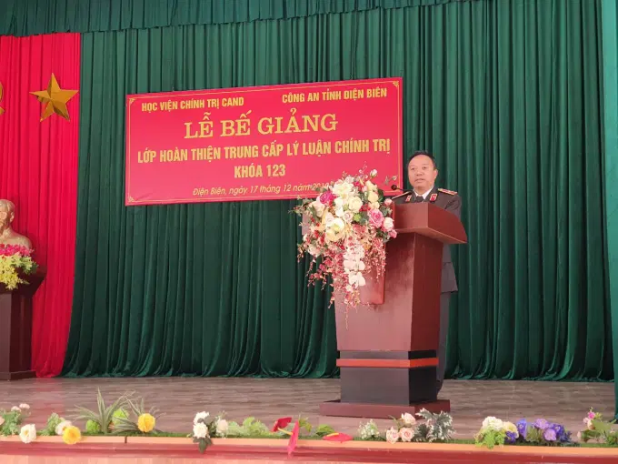 Phát biểu tại Lễ bế giảng, Đồng chí Đại tá Lò Văn Khụt, Phó Giám đốc Công an tỉnh Điện Biên gửi lời cảm ơn đến Ban Giám đốc Học viện Chính trị Công an nhân dân đã phối hợp và hỗ trợ mở lớp hoàn thiện Trung cấp lý luận chính trị cho các cán bộ chiến sĩ của Công an tỉnh Điện Biên được tham gia lớp học. Đồng chí yêu cầu các học viên vận dựng những kiến thức mới, tư duy mới tiếp thu trong thời gian học tập vào thực tiễn công tác để nâng cao chất lượng, hiệu quả các mặt công tác, đồng thời trưởng thành hơn trong nhận thức, tư tưởng cũng như vững vàng hơn về bản lĩnh chính trị