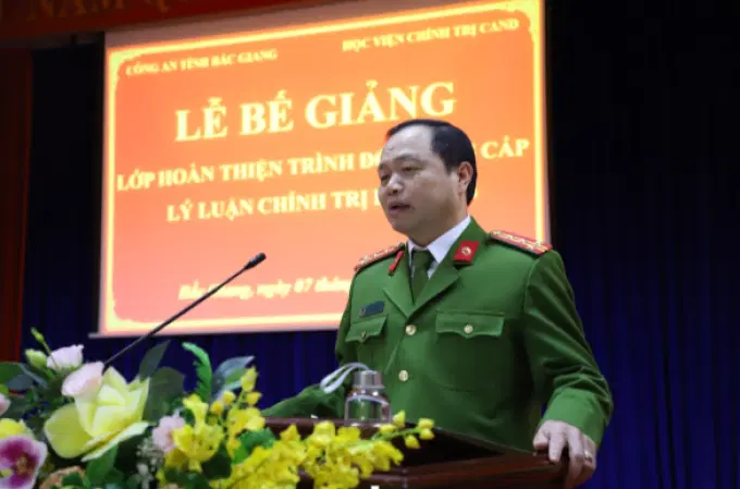 Phát biểu tại Lễ bế giảng, đồng chí Đại tá Dương Ngọc Sáu, Phó Giám đốc Công an tỉnh Bắc Giang trân trọng gửi lời cảm ơn đến Ban Giám đốc Học viện Chính trị Công an nhân dân đã phối hợp mở lớp hoàn thiện Trung cấp lý luận chính trị cho các cán bộ, chiến sĩ của Công an tỉnh. Đồng thời, đồng chí hy vọng trong thời gian tới sẽ tiếp tục nhận được sự quan tâm hơn nữa của Ban Giám đốc Học viện Chính trị Công an nhân dân trong việc phối hợp, liên kết mở các lớp đào tạo, bồi dưỡng cho cán bộ của Công an tỉnh. Đồng chí cũng đề nghị các học viên vận dụng có hiệu quả những kiến thức đã được lĩnh hội vào thực tiễn công tác để tham mưu cho lãnh đạo đơn vị hoàn thành xuất sắc các nhiệm vụ chính trị tại địa phương; tiếp tục học tập, nghiên cứu, rèn luyện để nâng cao năng lực, đáp ứng yêu cầu nhiệm vụ trong tình hình mới.