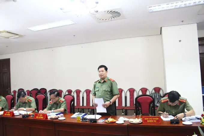 Đồng chí Trung tướng, PGS.TS Trần Minh Thư, nguyên Viện trưởng Viện Chiến lược và Khoa học Công an, Chủ tịch Hội đồng phát biểu tại buổi nghiệm thu