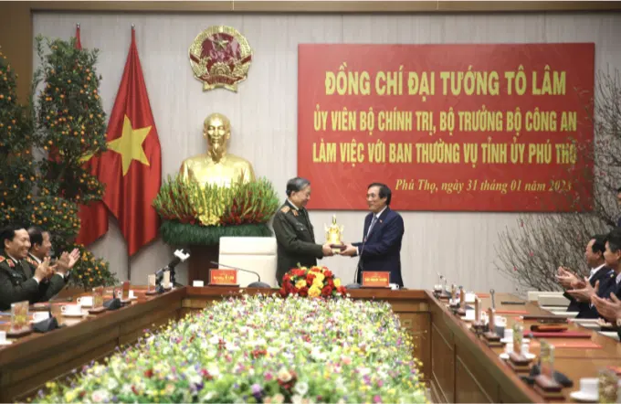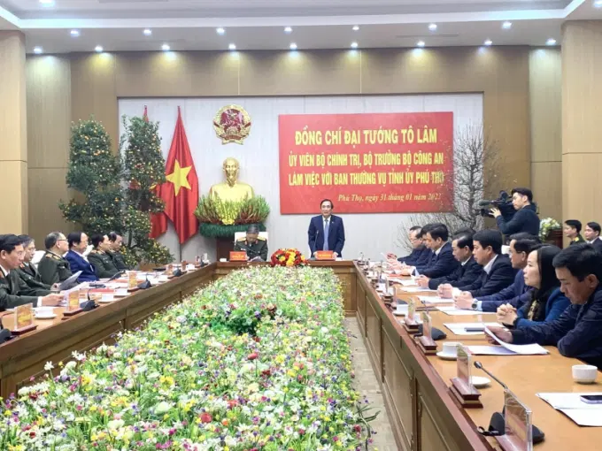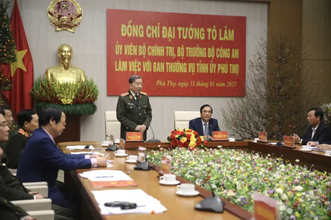 * Cùng ngày, Bộ trưởng Tô Lâm và đoàn công tác đã có buổi làm việc với Ban Thường vụ Tỉnh ủy Phú Thọ. Cùng dự buổi làm việc có đồng chí Bùi Minh Châu, Uỷ viên Trung ương Đảng, Bí thư Tỉnh ủy và các đồng chí trong Ban Thường vụ Tỉnh ủy Phú Thọ.