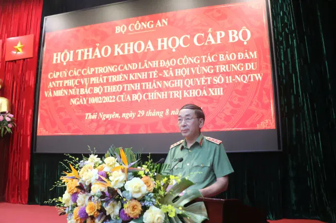 Phát biểu chỉ đạo tại Hội thảo, đồng chí Thượng tướng, PGS.TS Trần Quốc Tỏ, Thứ trưởng Bộ Công an khẳng định: Hội thảo này là một trong những hình thức để nhìn nhận, đánh giá lại 02 năm thực hiện Nghị quyết 11, đồng thời tiếp tục là hoạt động nghiên cứu, góp phần quán triệt đưa Nghị quyết Đại hội lần thứ XIII của Đảng vào thực tiễn; Hội thảo được tổ chức tại thời điểm hơn 02 năm toàn Đảng, toàn quân, toàn dân quán triệt, triển khai thực hiện Nghị quyết 11, có ý nghĩa quan trọng để đánh giá kết quả đạt được cũng như hạn chế, khó khăn, vướng mắc, từ đó đề ra định hướng thực hiện Nghị quyết 11 trong thời gian tới. Đồng chí trân trọng cảm ơn các đồng chí đại biểu, các nhà khoa học đã đến dự và phát biểu tham luận tại Hội thảo với nhiều ý kiến chuyên sâu, thể hiện tinh thần trách nhiệm, thái độ khoa học đối với công tác bảo đảm an ninh, trật tự, phục vụ phát triển kinh tế - xã hội vùng trung du và miền núi Bắc Bộ; cảm ơn sự phối hợp chặt chẽ của Tỉnh ủy Thái Nguyên và sự ủng hộ giúp đỡ của các bộ, ban, ngành Trung ương để Hội thảo được tổ chức thành công, tốt đẹp; đặc biệt là sự quan tâm, phối hợp, giúp đỡ để lực lượng Công an nhân dân hoàn thành xuất sắc nhiệm vụ bảo đảm an ninh, trật tự phục vụ phát triển kinh tế vùng thời gian qua. Trong thời gian tới, rất mong muốn tiếp tục nhận được sự quan tâm, phối hợp chặt chẽ, ủng hộ giúp đỡ nhiều hơn.