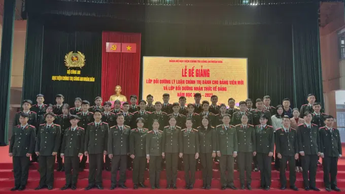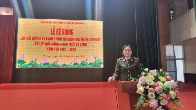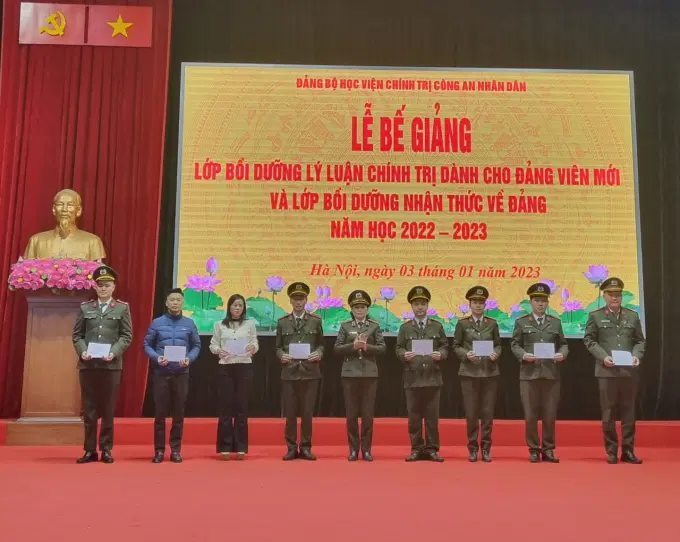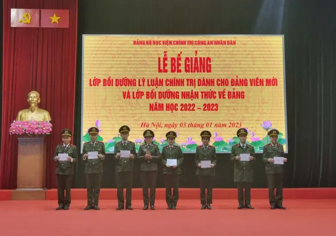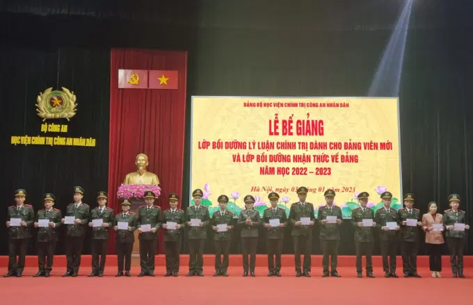 Thực hiện chương trình công tác của Đảng ủy Học viện Chính trị CAND, chiều ngày 03/01/2023, Đảng ủy Học viện đã trang trọng tổ chức Lễ Bế giảng lớp Bồi dưỡng lý luận chính trị dành cho đối tượng kết nạp Đảng và Bồi dưỡng lý luận chính trị dành cho đảng viên mới năm học 2022-2023. Dự và chủ trì buổi lễ có đồng chí Thiếu tướng, PGS. TS Đinh Ngọc Hoa, Phó Bí thư Đảng ủy, Phó Giám đốc Học viện. Tham dự buổi lễ có đại diện cấp ủy các tổ chức đảng trực thuộc Đảng ủy Học viện, đại diện lãnh đạo Phòng Chính trị và 53 học viên 02 lớp học.