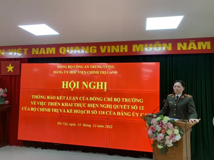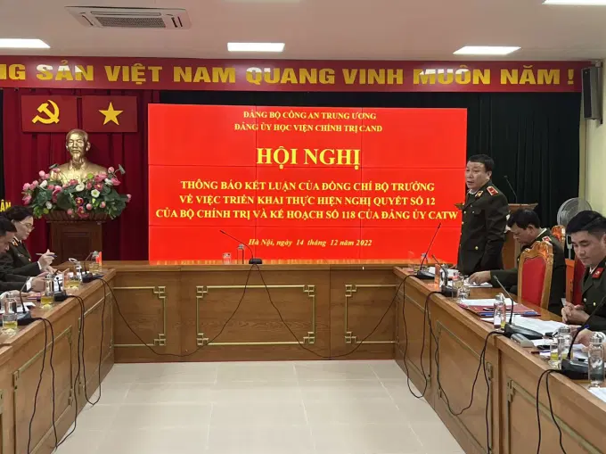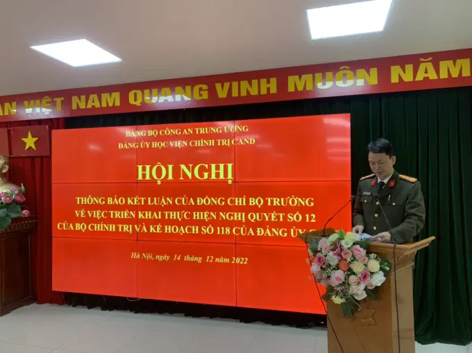 Ngày 14/12/2022, Đảng ủy Học viện Chính trị Công an nhân dân (CAND) trang trọng tổ chức Hội nghị thông báo kết luận của đồng chí Bí thư Đảng ủy Công an Trung ương, Bộ trưởng Bộ Công an tại Hội nghị đánh giá kết quả triển khai thực hiện Nghị quyết số 12-NQ/TW, ngày 16-3-2022 của Bộ Chính trị (Nghị quyết số 12 của Bộ Chính trị) và Kế hoạch số 118-KH/ĐUCA, ngày 25-5-2022 của Đảng ủy Công an Trung ương về thực hiện Nghị quyết số 12 của Bộ Chính trị về đẩy mạnh xây dựng lực lượng Công an nhân dân thật sự trong sạch, vững mạnh, chính quy, tinh nhuệ, hiện đại, đáp ứng yêu cầu, nhiệm vụ trong tình hình mới (Kế hoạch số 118 của Đảng ủy Công an Trung ương). Đồng thời Hội nghị đã nghe các đơn vị báo cáo tiến độ triển khai đề án trung tâm của Học viện và các đề án thành phần nhằm triển khai thắng lợi Nghị quyết số 12 của Bộ Chính trị và Kế hoạch số 118 của Đảng ủy Công an Trung ương trong Đảng ủy Học viện.