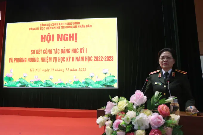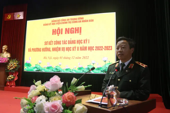 Phát biểu khai mạc Hội nghị, đồng chí Trung tướng, PGS.TS Phan Xuân Tuy, Bí thư Đảng ủy, Giám đốc Học viện đã nhận định: Học kỳ I năm học 2022-2023 diễn ra trong thời gian toàn lực lượng CAND quán triệt, triển khai thực hiện Nghị quyết số 12-CT/TW, ngày 16-3-2022 của Bộ Chính trị khóa XIII về “Đẩy mạnh xây dựng lực lượng CAND thật sự trong sạch, vững mạnh, chính quy, tinh nhuệ, hiện đại đáp ứng yêu cầu, nhiệm vụ trong tình hình mới” (Nghị quyết số 12 của Bộ Chính trị). Đảng bộ Học viện đang chuẩn bị sơ kết giữa nhiệm kỳ Đại hội Đảng bộ lần thứ II, nhiệm kỳ 2020-2025; đề ra những mục tiêu, nhiệm vụ phát triển Học viện trong nửa cuối nhiệm kỳ Đại hội và những năm tiếp theo. Đây là dịp sinh hoạt chính trị sâu rộng trong toàn Đảng bộ Học viện. Đồng thời cũng là dịp để Học viện nhìn lại, đánh giá một cách toàn diện, sâu rộng, thực chất về công tác xây dựng Đảng trong Đảng bộ Học viện và quyết tâm đổi mới toàn diện, căn bản, có đột phá nhằm thực hiện thật tốt Nghị quyết số 12 của Bộ Chính trị và sẵn sàng nhận, hoàn thành xuất sắc mọi nhiệm vụ Đảng ủy CATW, lãnh đạo Bộ Công an giao; đồng thời, hưởng ứng đợt thi đua đặc biệt chào mừng kỷ niệm 10 năm ngày thành lập Học viện, quyết tâm về đích sớm hơn các mục tiêu Học viện đã đề ra đến năm 2025.