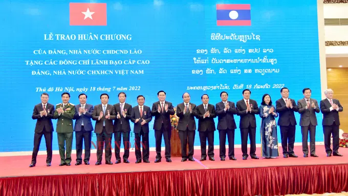 Chiều 18/7, Lễ trao tặng Huân chương của Đảng và Nhà nước Cộng hoà Dân chủ Nhân dân Lào tặng các đồng chí Lãnh đạo cấp cao Đảng và Nhà nước Cộng hoà Xã hội Chủ nghĩa Việt Nam đã được tổ chức trọng thể tại Thủ đô Hà Nội.