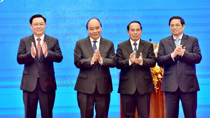 Chủ tịch Nước Nguyễn Xuân Phúc, Thủ tướng Phạm Minh Chính, Chủ tịch Quốc hội Vương Đình Huệ, Ủy viên Bộ Chính trị, Thường trực Ban Bí thư Trung ương Đảng Nhân dân cách mạng Lào, Phó Chủ tịch nước Cộng hòa dân chủ Nhân dân Lào Bounthong Chitmany, và các đồng chí lãnh đạo Đảng Nhà nước Việt Nam nhận Huân chương Tự do Hạng Nhất (ISALA) của Nước CHDCND Lào. Ảnh: Lâm Hiển
