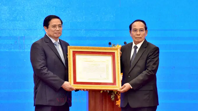 Ủy viên Bộ Chính trị, Thường trực Ban Bí thư Trung ương Đảng Nhân dân cách mạng Lào, Phó Chủ tịch nước Cộng hòa dân chủ Nhân dân Lào Bounthong Chitmany trao Huân chương Vàng Quốc gia cho Uỷ viên Bộ Chính trị, Thủ tướng Chính phủ Phạm Minh Chính. Ảnh: Lâm Hiển