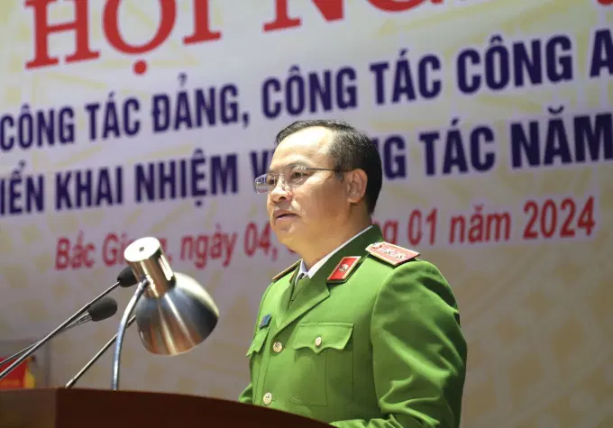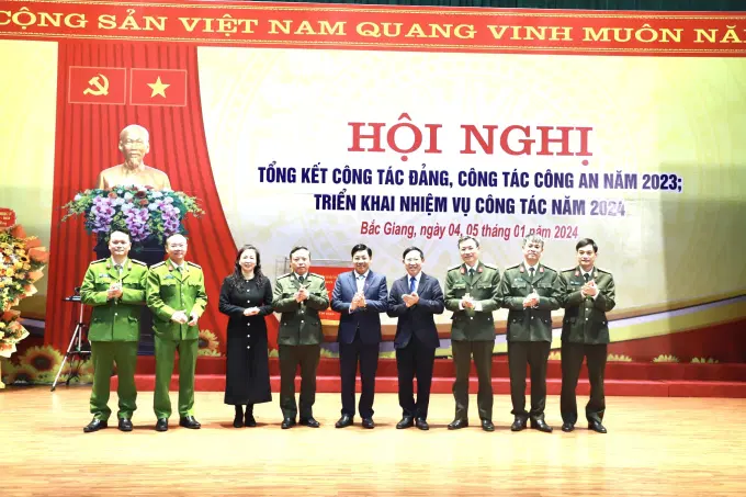 Chiều ngày 04/01/2024, Công an tỉnh Bắc Giang tổ chức hội nghị tổng kết công tác đảng, công tác Công an năm 2023; triển khai nhiệm vụ công tác năm 2024. Tham dự hội nghị đồng chí Dương Văn Thái, Ủy viên T.Ư Đảng, Bí thư Tỉnh ủy, Trưởng Đoàn đại biểu Quốc hội tỉnh; Trung tướng Nguyễn Văn Long, Ủy viên Ban Thường vụ Đảng ủy Công an Trung ương, Thứ trưởng Bộ Công an; Trung tướng Tô Ân Xô, Trợ lý Ủy viên Bộ Chính trị, Bộ trưởng Bộ Công an; Trung tướng PGS.TS Phan Xuân Tuy, Giám đốc Học viện Chính trị CAND; Trung tướng Trần Đức Tuấn, Chánh Thanh tra Bộ Công an; Thiếu tướng Tạ Quang Huy, Phó Chủ nhiệm UBKT Đảng ủy Công an Trung ương; Đại tá Nguyễn Đức Huy - Phó Chánh Văn phòng Bộ Công an.