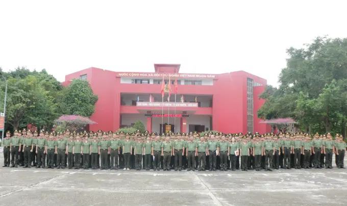 Đồng chí Thứ trưởng cùng các đồng chí đại biểu thăm, động viên học viên khóa D10 của Học viện Chính trị CAND đang tập luyện đầu khóa và chụp ảnh lưu niệm