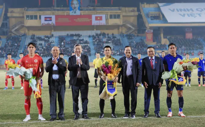 Tại buổi lễ, Bộ trưởng Tô Lâm và đồng chí Trần Sĩ Thanh cùng Thống tướng Neth Savoeun, Tổng Cục trưởng Tổng cục Công an quốc gia, Bộ Nội vụ Vương quốc Campuchia và Thống tướng Sao Sokha, Phó Tổng Tư lệnh Quân đội hoàng gia, Tư lệnh hiến binh Vương quốc Campuchia tặng hoa chúc mừng Tổ trọng tài, cầu thủ đội CLB Bóng đá CAHN và đội bóng Bộ Tư lệnh Hiến binh Campuchia.