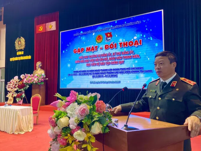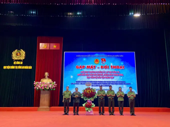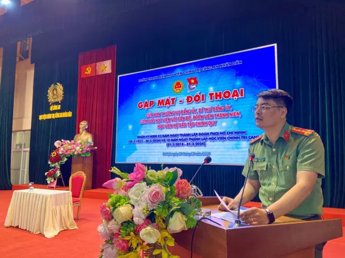 Nhân dịp kỷ niệm 93 năm Ngày thành lập Đoàn TNCS Hồ Chí Minh (26/3/1931 - 26/3/2024), 10 năm Ngày thành lập Học viện Chính trị CAND. Được sự đồng ý của Ban Thường vụ Đảng ủy, Ban Giám đốc Học viện; sáng ngày 26/3/2024, Đoàn Thanh niên Học viện chủ trì, phối hợp với Phòng Quản lý học viên, các đơn vị chức năng tham mưu tổ chức chương trình Gặp mặt - Đối thoại giữa Ban Thường vụ Đảng ủy, Bí thư Đảng ủy, Giám đốc Học viện với cán bộ, đoàn viên thanh niên, học viên Học viện. Trung tướng, PGS.TS Phan Xuân Tuy, Bí thư Đảng ủy, Giám đốc Học viện, chủ trì buổi gặp mặt. Tham dự chương trình có Thượng tá, TS Nguyễn Văn Tuấn, Ủy viên Ban Thường vụ, Phó Giám đốc Học viện, cùng đại  diện cấp ủy, lãnh đạo các đơn vị chức năng liên quan, cùng toàn thể các đồng chí cán bộ, đoàn viên thanh niên, học viên Học viện.