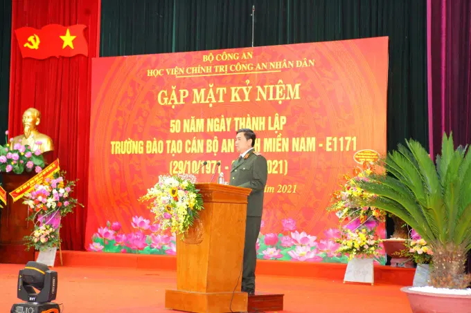 Tại buổi gặp mặt, đồng chí Đại tá Nguyễn Văn Nghiêm thay mặt các thế hệ cán bộ, học viên trường E1171 phát biểu gửi lời cảm ơn đến các đồng chí lãnh đạo, nguyên lãnh đạo Bộ Công an, Đảng ủy Công an Trung ương đã quan tâm, đồng hành cùng nhà trường trong quá trình xây dựng và phát triển; cảm ơn Đảng ủy, Ban Giám đốc Học viện Chính trị CAND đã tận tình giúp đỡ, tạo mọi điều kiện thuận lợi nhất để tổ chức buổi gặp mặt trang trọng, ý nghĩa này. Trong diễn văn kỷ niệm đã ôn lại quá trình xây dựng, phát triển của nhà trường qua từng thời kỳ. Trong đó khẳng định cuối những năm 1960, đầu những năm 1971, cuộc chiến tranh kháng chiến chống Mỹ của nhân dân ta dưới sự lãnh đạo của Đảng và Bác Hồ đã thu được những thắng lợi to lớn, Bộ Chính trị có những dự báo về khả năng thắng lợi của cách mạng miền Nam trong thời gian không xa. Để chuẩn bị nguồn cán bộ trước mắt và lâu dài cho an ninh miền Nam và bồi dưỡng đội ngũ cán bộ an ninh miền Bắc kịp thời chi viện, ngày 29/10/1971 đồng chí Trần Quốc Hoàn - Ủy viên Bộ Chính trị, Bộ trưởng Bộ Công an ký quyết định số 1250/QĐ-BCA về việc thành lập trường đào tạo cán bộ cho an ninh miền nam lấy ký hiệu E1171 đặt tại thôn Tĩnh Luyện xã Đồng Tĩnh, huyện Tam Dương, Tỉnh Vĩnh Phú (nay là Vĩnh Phúc) với nhiệm vụ: (1) Bổ túc nâng cao trình độ văn hóa chính trị, nghiệp vụ cho cán bộ an ninh miền Nam; (2) Đào tạo cán bộ cho ngành An ninh miền nam về trình độ văn hóa, chính trị, nghiệp vụ và kỹ thuật; (3) Đào tạo văn hóa theo các bậc học phổ thông cho con em các cán bộ an ninh miền Nam và cán bộ chủ chốt của các ngành thuộc các địa phương miền Nam.