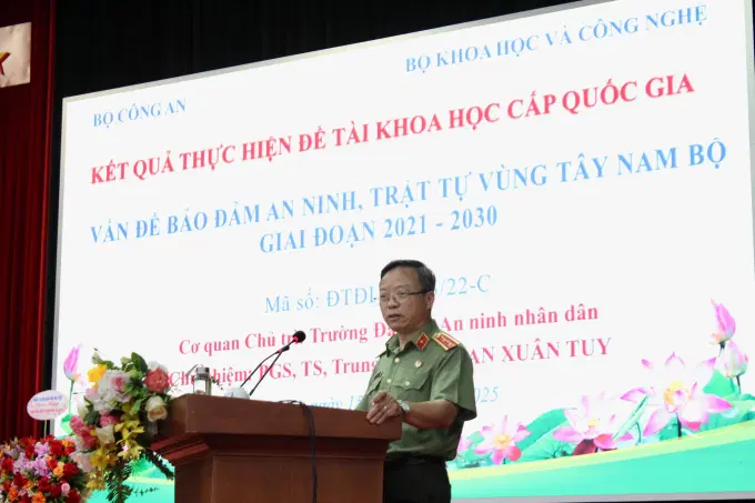 Đặc biệt, tại buổi lễ, kết quả nghiên cứu của đề tài khoa học cấp quốc gia “Vấn đề bảo đảm an ninh, trật tự vùng Tây Nam Bộ giai đoạn 2021–2030”, do Trung tướng, PGS.TS, Nhà giáo Ưu tú Phan Xuân Tuy, Giám đốc Học viện làm chủ nhiệm đã được giới thiệu và nhận được sự quan tâm sâu sắc từ các đại biểu. Đề tài đã đưa ra những luận cứ khoa học có giá trị thực tiễn cao, đồng thời đề xuất các giải pháp chiến lược nhằm củng cố thế trận an ninh nhân dân, nâng cao hiệu quả đấu tranh phòng, chống tội phạm xuyên biên giới, bảo đảm an ninh chính trị, trật tự an toàn xã hội tại khu vực Tây Nam Bộ. Bên cạnh việc giới thiệu kết quả nghiên cứu, đồng chí Giám đốc Học viện cũng chia sẻ nhiều kinh nghiệm thực tiễn quý báu trong công tác quản lý và tổ chức hoạt động khoa học, đặc biệt là từ quá trình triển khai các đề tài cấp quốc gia.