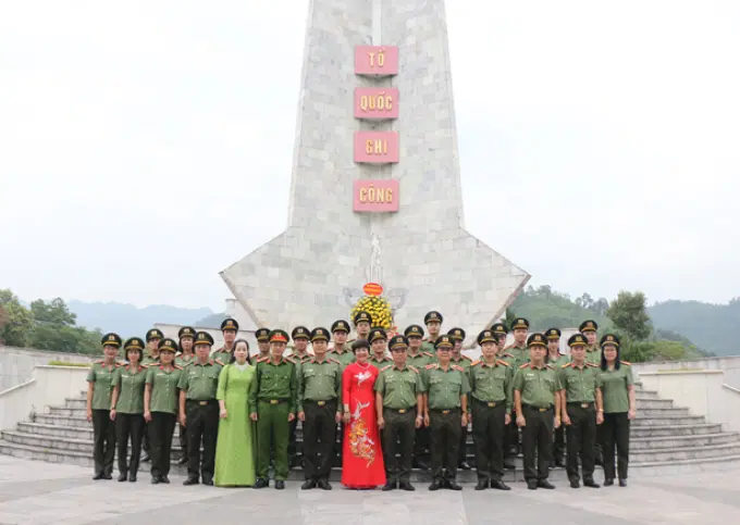 Đoàn công tác Học viện cùng Công an tỉnh chụp ảnh lưu niệm tại Nghĩa trang Liệt sĩ tỉnh Cao Bằng, tượng đài Chủ tịch Hồ Chí Minh trong khuôn viên công an tỉnh Cao Bằng