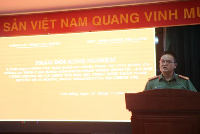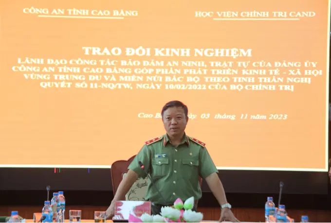 Thực hiện Kế hoạch số 25/KH-BCA-T03 ngày 17/01/2023 của Bộ Công an về việc tổ chức hội thảo khoa học cấp Bộ “Cấp uỷ các cấp trong Công an nhân dân lãnh đạo công tác bảo đảm an ninh, trật tự phục vụ phát triển kinh tế - xã hội vùng trung du và miền núi Bắc Bộ theo tinh thần Nghị quyết số 11-NQ/TW ngày 10/02/2022 của Bộ Chính trị khoá XIII”; ngày 03/11/2023, Đoàn công tác Học viện Chính trị CAND do đồng chí Trung tướng, PGS.TS Phan Xuân Tuy, Bí thư Đảng ủy, Giám đốc Học viện làm trưởng đoàn đã làm việc với Công an tỉnh Cao Bằng một số nội dung liên quan phục vụ công tác tổ chức hội thảo.