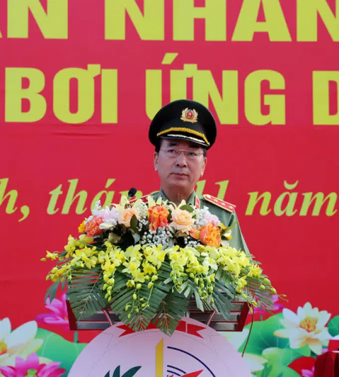 Thứ trưởng Trần Quốc Tỏ thay mặt Đảng uỷ Công an Trung ương, lãnh đạo Bộ Công an phát biểu khai mạc Hội thao CAND năm 2023