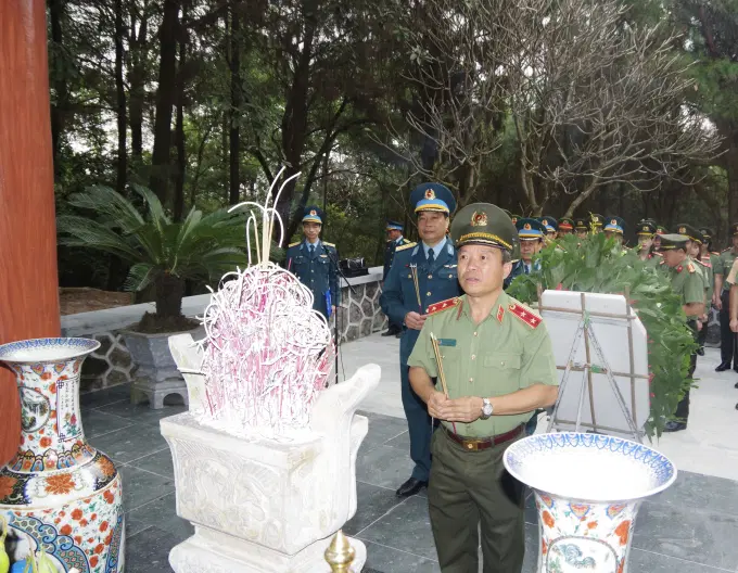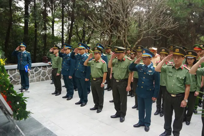 Đồng chí Trung tướng, PGS.TS Phan Xuân Tuy, Bí thư Đảng ủy, Giám đốc Học viện Chính trị CAND cùng đoàn công tác dâng hương, dâng hoa tại Bia tưởng niệm các liệt sĩ phòng không