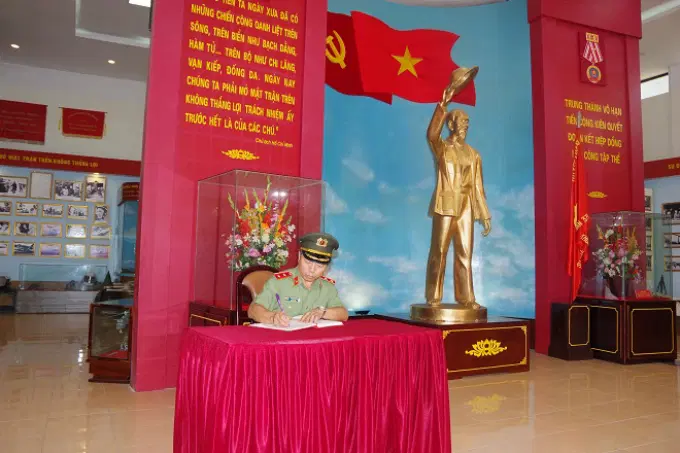 Đồng chí Trung tướng, PGS.TS Phan Xuân Tuy, Bí thư Đảng ủy, Giám đốc Học viện Chính trị CAND ghi sổ lưu niệm tại Nhà truyền thống Sư đoàn Không quân 371