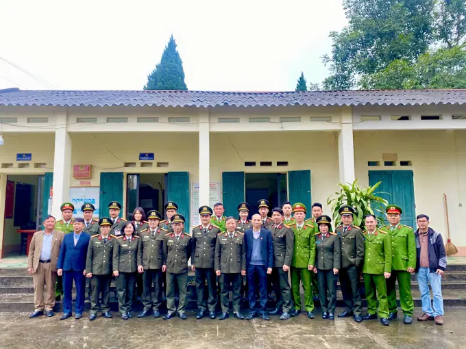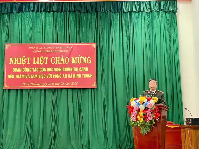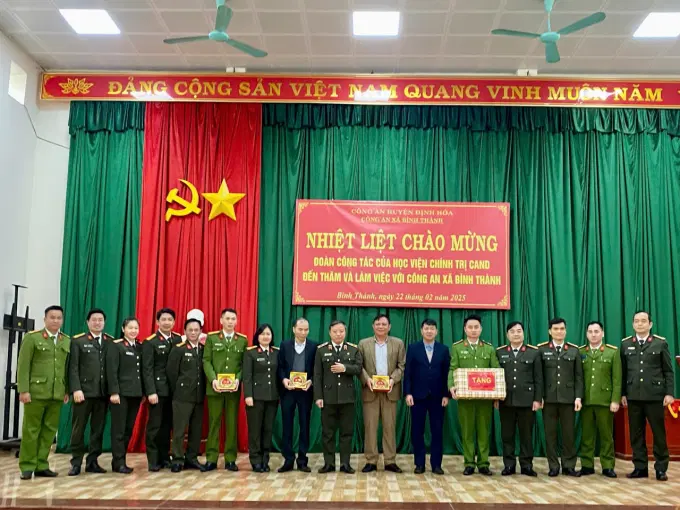 Nhân dịp này, Đoàn Công tác của Học viện đã tới thăm và tặng quà Công an xã Bình Thành, huyện Định Hóa, tỉnh Thái Nguyên (nơi Trường Đảng Nguyễn Ái Quốc đứng chân). Tại buổi làm việc, Đoàn Công tác đã được nghe đại diện Ban Chỉ huy Công an xã báo cáo tình hình và kết quả công tác thực hiện Kế hoạch tấn công trấn áp tội phạm, đảm bảo an ninh trật tự Tết Nguyên đán Ất Tỵ - 2025 của Bộ Công an, Công an tỉnh Thái Nguyên. Đồng chí PGS.TS.NGƯT, Trung tướng Phan Xuân Tuy, Bí thư Đảng ủy, Giám đốc Học viện, Trưởng Đoàn Công tác đánh giá cao những kết quả của Công an xã đã đạt được trong thời gian qua, chúc tập thể Công an xã hoàn thành xuất sắc chỉ tiêu công tác trong năm 2025, đảm bảo tốt công tác an ninh, trật tự an toàn xã hội tại địa bàn cơ sở. Đồng thời, đồng chí Bí thư Đảng ủy, Giám đốc Học viện nhấn mạnh vai trò, tầm quan trọng của đội ngũ cán bộ và công tác cán bộ đối với sự nghiệp cách mạng của Đảng nói chung, lực lượng CAND nói riêng. Triển khai thực hiện Kết luận số 94-KL/TW, ngày 28/3/2014 của Ban Bí thư về việc tiếp tục đổi mới việc học tập lý luận chính trị trong hệ thống giáo dục quốc dân; Kết luận số 91-KL/TW, ngày 12/8/2024 của Bộ Chính trị về thực hiện đổi mới căn bản, toàn diện giáo dục và đào tạo, trong thời gian vừa qua, các hoạt động đào tạo, nghiên cứu khoa học, tham mưu và hợp tác của Học viện đã được tập trung xây dựng, đổi mới góp phần triển khai thực hiện hiệu quả nhiệm vụ đào tạo các trình độ lý luận chính trị cho cán bộ Công an các đơn vị, địa phương theo Kết luận của Ban Bí thư giao Bộ Công an và trực tiếp là Học viện Chính trị CAND, góp phần xây dựng lực lượng CAND cách mạng, chính quy, tinh nhuệ, hiện đại, đáp ứng yêu cầu, nhiệm vụ trong tình hình mới.