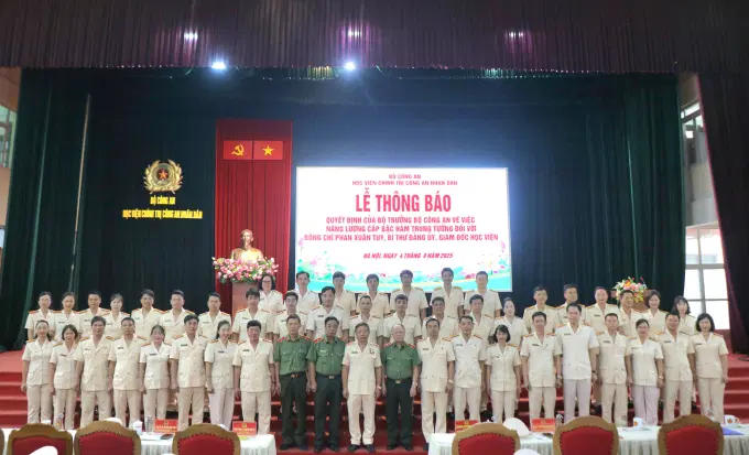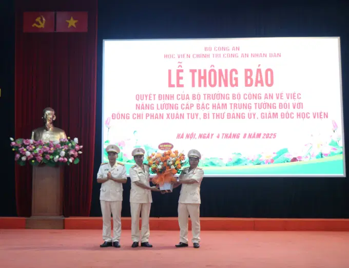 Tại Hội nghị, các đồng chí trong Ban Thường vụ Đảng uỷ, Ban Giám đốc Học viện cùng toàn thể cán bộ, giảng viên, học viên đã tặng hoa chúc mừng đồng chí PGS.TS, NGƯT, Trung tướng Phan Xuân Tuy, Bí thư Đảng ủy, Giám đốc Học viện được Bộ trưởng Bộ Công an ký quyết định nâng lương cấp bậc hàm Trung tướng.