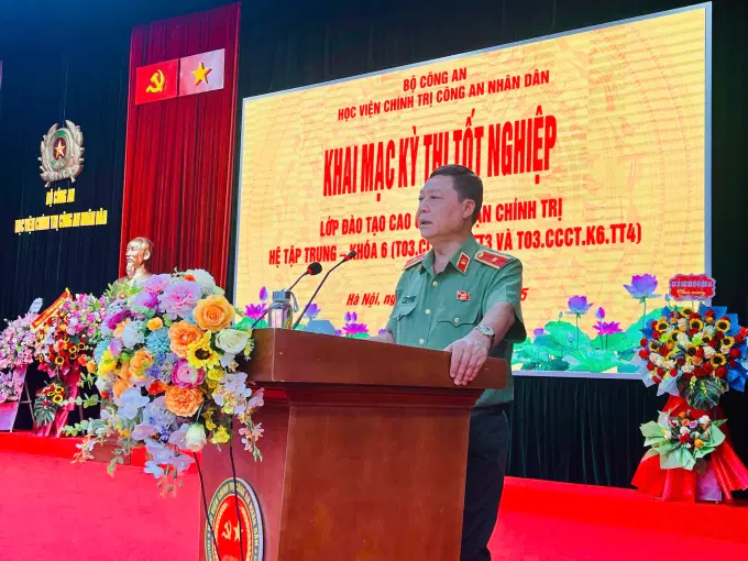 Phát biểu khai mạc kỳ thi, đồng chí TS, Thiếu tướng Nguyễn Như Lôi, Phó Giám đốc Học viện, Phó Chủ tịch Hội đồng thi chúc mừng các học viên lớp T03.CCCT.K6.TT3 và T03.CCCT.K6.TT4 đã hoàn thành toàn bộ chương trình học tập và đủ điều kiện dự thi tốt nghiệp đồng thời biểu dương các đơn vị chức năng thuộc Học viện đã phối hợp hiệu quả trong quá trình đào tạo cũng như chuẩn bị các điều kiện tổ chức kỳ thi. Đồng chí Phó Giám đốc Học viện cho biết, trong thời gian qua, Học viện Chính trị Công an nhân dân đã triển khai hiệu quả, thành công nhiệm vụ đào tạo cấp bằng Cao cấp lý luận chính trị cho cán bộ, chiến sĩ Công an, khẳng định năng lực, uy tín của Học viện cũng như cung cấp đội ngũ cán bộ có phẩm chất, có lý luận vững vàng cho toàn lực lượng. Đối với học viên của 02 lớp, toàn bộ quá trình đào tạo đã được Học viện triển khai khẩn trương, nghiêm túc, đảm bảo chất lượng, tiến độ, 100% học viên hoàn thành các môn học và đủ điều kiện dự thi tốt nghiệp.
