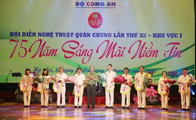 Thượng tướng Nguyễn Văn Thành, Ủy viên Trung ương Đảng, Thứ trưởng Bộ Công an tặng cờ lưu niệm cho các đoàn tham gia Hội diễn khu vực I