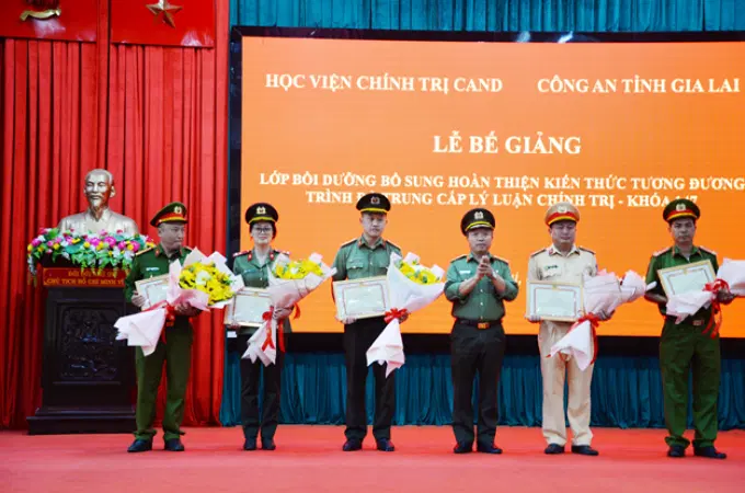 Lễ bế giảng lớp bồi dưỡng bổ sung hoàn thiện kiến thức tương đương trình độ Trung cấp lý luận chính trị, Khóa 147 mở tại Công an tỉnh Gia Lai đã diễn ra thành công tốt đẹp. Hy vọng rằng, khi trở về công tác, học viên sẽ vận dụng tốt các kiến thức đã được học vào thực tiễn nhằm đáp ứng yêu cầu nhiệm vụ chính trị trong tình hình mới, góp phần vào công tác xây dựng Đảng, xây dựng lực lượng Công an nhân dân theo tinh thần của Nghị quyết số 12-NQ/TW, ngày 16/3/2022 của Bộ Chính trị về “Đẩy mạnh xây dựng lực lượng CAND thật sự trong sạch, vững mạnh, chính quy, tinh nhuệ, hiện đại, đáp ứng yêu cầu, nhiệm vụ trong tình hình mới”./.