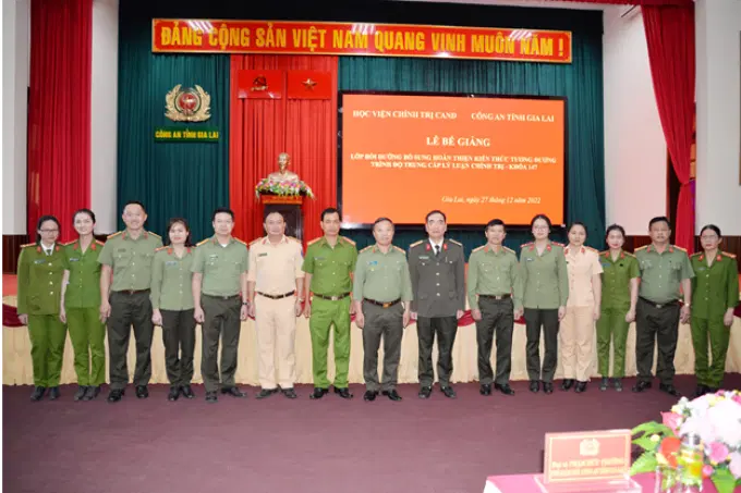 Thực hiện chương trình, kế hoạch công tác của Học viện, chiều ngày 27/12/2022, Học viện Chính trị Công an nhân dân phối hợp với Công an tỉnh Gia Lai tổ chức Lễ bế giảng lớp bồi dưỡng bổ sung hoàn thiện kiến thức tương đương trình độ Trung cấp lý luận chính trị, Khóa 147 cho cán bộ, chiến sĩ của Công an tỉnh Gia Lai.