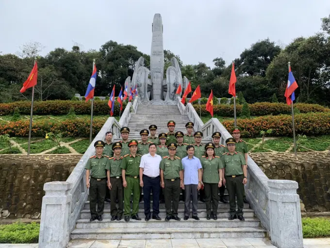 Đồng chí Phó Giám đốc Học viện và học viên thăm quan, tìm hiểu Khu di tích lịch sử cách mạng Việt Nam - Lào tại bản Lao Khô