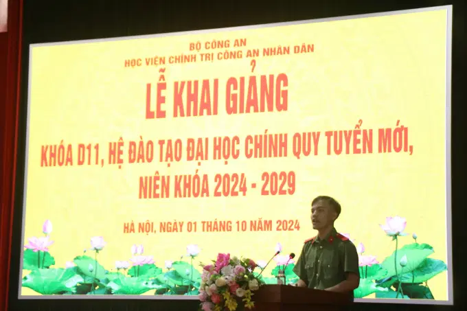Phát biểu chỉ đạo trong buổi Lễ Khai giảng, đồng chí Trung tướng, PGS. TS, NGƯT Phan Xuân Tuy, Bí thư Đảng ủy, Giám đốc Học viện dự thân ái gửi lời chúc mừng tới các tân học viên Khóa D11 đã xuất sắc vượt qua kỳ thi Tốt nghiệp Trung học phổ thông Quốc gia và kỳ thi đánh giá năng lực của Bộ Công an năm 2024 với tỷ lệ “chọi” rất cao, được tổ chức nghiêm túc, khoa học, chặt chẽ, công khai, minh bạch để trúng tuyển và trở thành tân học viên Học viện Chính trị CAND. Qua báo cáo nhanh của của Phòng Quản lý đào tạo và bồi dưỡng nâng cao, Phòng Quản lý học viên về kết quả kiểm tra hồ sơ tuyển sinh, học bạ Trung học phổ thông và kết quả kỳ thi đánh giá năng lực của Bộ Công an năm 2024, đồng chí Bí thư, Đảng ủy, Giám đốc Học viện đánh giá cao chất lượng đầu vào của học viên Khóa D11; đồng thời, tự hào, tin tưởng học viên Khóa D11 đã, đang và sẽ luôn hoàn thành xuất sắc nhiệm vụ khóa học đề ra. Theo đó, đồng chí Bí thư Đảng ủy, Giám đốc Học viện yêu cầu học viên Khóa D11 thực hiện tốt một số nội dung sau: (1) Phải nhận thức đúng đắn, tự giác cao nhất với tâm thế là chiến sĩ CAND Việt Nam anh hùng; luôn chấp hành nghiêm Điều lệnh CAND, 6 điều Bác Hồ dạy CAND, duy trì kỷ luật, kỷ cương, giải quyết toàn diện các mối quan hệ của người chiến sĩ CAND nhất là đối với công việc, đối với tự mình, đối với đồng chí, đồng đội và đối với Nhân dân. (2) Ngay từ những ngày đầu tiên, từng học viên luôn xác định phải “tự lực, tự cường”, tự giác trong học tập, rèn luyện, kết hợp giữa học tập lý thuyết, nghiên cứu tài liệu với sự hướng dẫn của thầy, cô giáo; phải xác định cho bản thân động cơ, mục đích học tập, rèn luyện đúng đắn; từ đó xác định và xây dựng cho bản thân phương pháp học tập khoa học, phù hợp với bản thân; đồng thời, phải luôn đặt ra cho mình mục tiêu và thời gian cụ thể để đạt được mục tiêu đó như: kết thúc khóa học được cấp Bằng Tốt nghiệp loại Giỏi; được kết nạp vào Đảng Cộng sản Việt Nam năm học thứ ba,... phấn đấu để khi kết thúc khóa học trở thành sĩ quan chính trị của lực lượng CAND, có bản lĩnh chính trị vững vàng, phẩm chất đạo đức cách mạng trong sáng, nghiệp vụ pháp luật tinh thông, có khả năng hòa nhập, làm việc trong môi trường quốc tế, xứng đáng là lứa học viên của lực lượng CAND đào tạo hàng năm đầu tiên trong lực lượng CAND thực hiện nghiêm túc Nghị quyết 12 của Bộ Chính trị ngày 16/3/2022. (3) Phải xác định và luôn coi Học viện là ngôi nhà thứ hai của mình; thầy, cô, học viên các khóa là gia đình của các mình; từ đó, để thể hiện tinh thần, thái độ, hành động góp phần xây dựng văn hóa học viên của trường Đảng trong CAND.