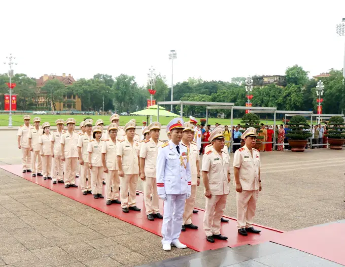 Trong không khí thiêng liêng, đoàn đại biểu thành kính dâng hương, dâng hoa tưởng niệm, bày tỏ lòng biết ơn vô hạn và kính trọng sâu sắc đối với Chủ tịch Hồ Chí Minh - Người đã cống hiến, hy sinh trọn đời cho sự nghiệp giải phóng dân tộc, giải phóng giai cấp, đấu tranh cho sự nghiệp hòa bình và hạnh phúc của dân tộc Việt Nam. Trước anh linh Chủ tịch Hồ Chí Minh, các đại biểu thành kính tưởng nhớ và bày tỏ lòng biết ơn vô hạn Chủ tịch Hồ Chí Minh vĩ đại, Anh hùng giải phóng dân tộc, Danh nhân văn hóa thế giới, Người cha thân yêu của các lực lượng vũ trang nhân dân, Người sáng lập, chăm lo xây dựng, giáo dục, rèn luyện lực lượng Công an nhân dân Việt Nam anh hùng.