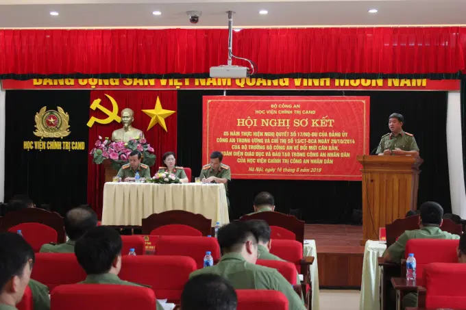 Ngày 16/8/2019, Học viện Chính trị Công an nhân dân tổ chức Hội nghị sơ kết 05 năm thực hiện Nghị quyết số 17/NQ-ĐU của Đảng ủy Công an trung ương và Chỉ thị số 13/CT-BCA ngày 28/10/2014 của Bộ trưởng Bộ Công an về đổi mới căn bản, toàn diện giáo dục và đào tạo trong Công an nhân dân. Đồng chí Đại tá, PGS.TS Đinh Ngọc Hoa, Phó Giám đốc Học viện, chủ trì Hội nghị. Tham dự có đồng chí: Đại tá Bùi Sơn Hiển, Phó Cục trưởng Cục Đào tạo; Đại tá Tạ Quang Huy, Ủy viên UBKT Đảng ủy Công an trung ương; Đại tá Nguyễn Trọng Chí, Phó Tư lệnh Bộ Tư lệnh Cảnh sát cơ động; đại diện lãnh đạo công an một số địa phương; đại diện lãnh đạo các đơn vị và toàn thể giảng viên Học viện.