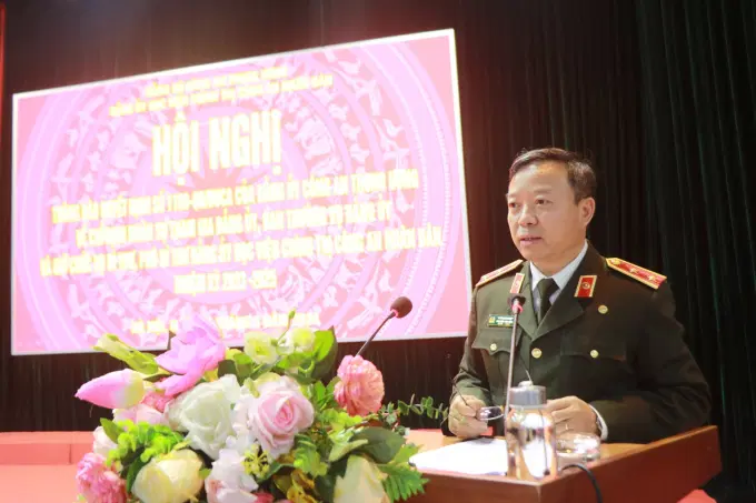 Đồng chí Trung tướng, PGS.TS Phan Xuân Tuy, Bí thư Đảng uỷ, Giám đốc Học viện phát biểu tại Hội nghị