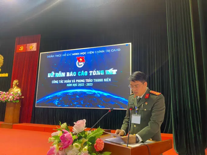 Thay mặt Ban Chấp hành Đoàn Thanh niên Học viện, Đại uý Trần Văn Bình, Bí thư Đoàn Thanh niên Học viện đề dẫn báo cáo kết quả một số công tác trọng tâm trong công tác Đoàn và phong trào thanh niên năm 2022 - 2023 và dự kiến triển khai Chương trình công tác năm học 2023 - 2024; đồng thời thông qua  trình chiếu Phóng sự tổng kết công tác đoàn để đánh giá cụ thể các mặt công tác đoàn trong năm học vừa qua. Theo đó, năm 2022 - 2023, dưới sự quan tâm, lãnh đạo, chỉ đạo của Đảng ủy, Ban Giám đốc Học viện; sự hỗ trợ, giúp đỡ, ủng hộ của cấp ủy, lãnh đạo các đơn vị, các tổ chức quần chúng, các cơ sở đoàn bạn. Cùng với sự nhiệt huyết, tinh thần trách nhiệm, cống hiến, quyết tâm của đội ngũ cán bộ đoàn, sự đồng thuận ủng hộ, hưởng ứng tham gia tích cực của đoàn viên thanh niên Học viện; kết quả công tác Đoàn và phong trào thanh niên của Đoàn Thanh niên Học viện đã đạt được một số thành tích đáng được ghi nhận. Ban Chấp hành Đoàn Thanh niên Học viện đã phát huy tinh thần xung kích, đoàn kết, duy trì, ổn định tổ chức đoàn. Khắc phục khó khăn, chủ động tham mưu với Đảng ủy, Ban Giám đốc Học viện tổ chức các hoạt động phong trào với nhiều đổi mới, sáng tạo, phù hợp với tình hình thực tế đơn vị. Các chương trình hoạt động của đoàn luôn bám sát nhiệm vụ chính trị của Học viện và chương trình công tác của Ban Thanh niên CAND; đồng thời tạo môi trường giáo dục, diễn đàn sinh hoạt chính trị, không gian bổ ích, ý nghĩa, thiết thực cho đoàn viên. Trong năm học 2022 - 2023, Ban Chấp hành Đoàn Thanh niên Học viện đã tập trung lãnh đạo tổ chức đoàn tham mưu tổ chức triển khai hiệu quả 12 hoạt động trọng tâm được tổ chức xuyên suốt trong năm học.