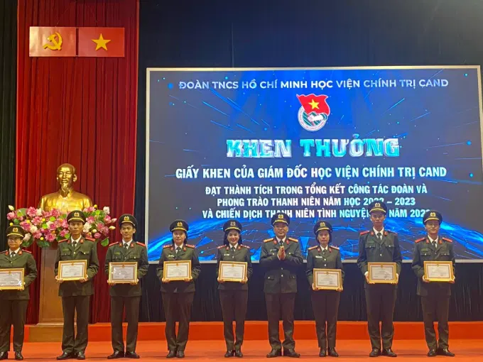 Hội nghị được nghe 02 phát biểu tham luận của đại diện Chi đoàn khối cán bộ và Chi đoàn khối học viên, đây là những tham luận đánh giá, phản ánh rất đúng, trúng về một số nội dung của hoạt động phong trào đoàn năm vừa qua những thành tích kết quả và hạn chế còn tồn tại, Ban Chấp Đoàn Thanh niên Học viện lĩnh hội, tiếp thu và bổ sung vào báo cáo tổng kết. Nhân dịp này, Đoàn Thanh niên Học viện đã điều hành tổ chức trao các hình thức khen thưởng của các cấp lãnh đạo cho các tập thể, cá nhân có thành tích xuất sắc trong công tác Đoàn và phong trào thanh niên năm học 2022 - 2023 và thành tích các nội dung công tác khác. Theo đó, đã trao trưởng cho 07 cá nhân vinh dự được nhận Bằng khen của Trung ương Đoàn TNCS Hồ Chí Minh và Trung ương Hội Sinh viên Việt Nam, 12 cá nhân vinh dự được nhận khen thưởng Giấy khen của Giám đốc Học viện Chính trị CAND, 03 cá nhân được nhận khen thưởng Giấy khen của Giám đốc Học viện Chính trị CAND thành tích xuất sắc lọt vào top 10 và đạt giải Nhất cấp Bộ, đại diện cho tuổi trẻ CAND tham dự vòng thi cấp Trung ương toàn quốc của Hội thi "Olympic tiếng Anh học sinh, sinh viên toàn quốc" lần thứ V. Ban Chấp hành Đoàn Thanh niên Học viện cũng đã trao tặng Giấy khen cho 62 cá nhân có thành tích xuất sắc trong công tác đoàn của Học viện.