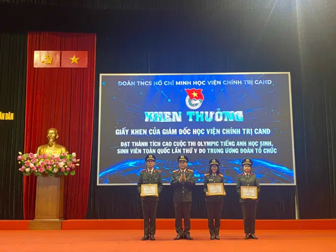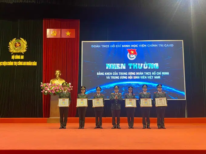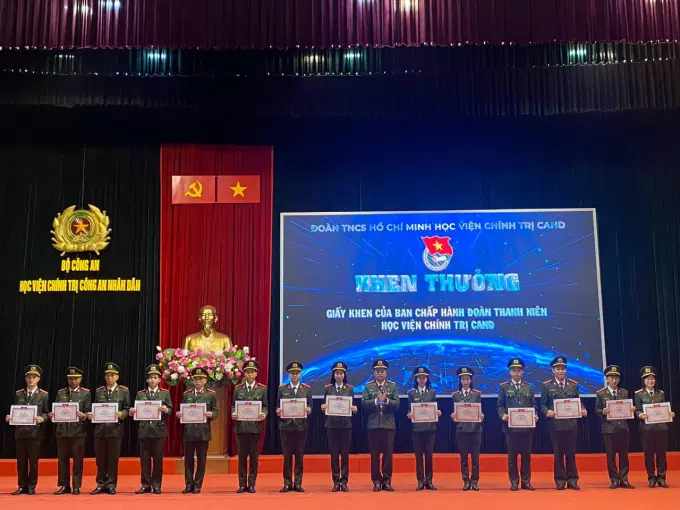 Đồng chí Thượng tá Nguyễn Văn Tuấn, Ủy viên Ban Thường vụ, Phó Giám đốc Học viện trao Bằng khen của Trung ương Đoàn, Trung ương Hội Sinh viên Việt Nam và Giấy khen của Giám đốc Học viện cho đoàn viên thanh niên có thành tích xuất sắc