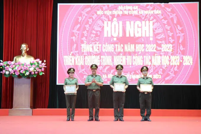Nhân dịp này, Học viện đã trao tặng danh hiệu thi đua và Giấy khen cho các tập thể, cá nhân có thành tích xuất sắc trong phong trào thi đua năm học 2022-2023; đồng thời tổ chức lễ phát động và ký giao ước thi đua phong trào thi đua “Vì an ninh tổ quốc” năm học 2023-2024 trong toàn Học viện.
